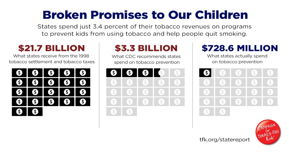 Since the states settled their lawsuits against the major tobacco companies in November 1998, our organizations have issued annual reports assessing how well the states have kept their promise to use a significant portion of their tobacco settlement funds to address the enormous health and financial toll of tobacco use in the United States. This year’s report finds, once again, that most states continue to shortchange programs that prevent kids from using tobacco products and help people quit using tobacco.